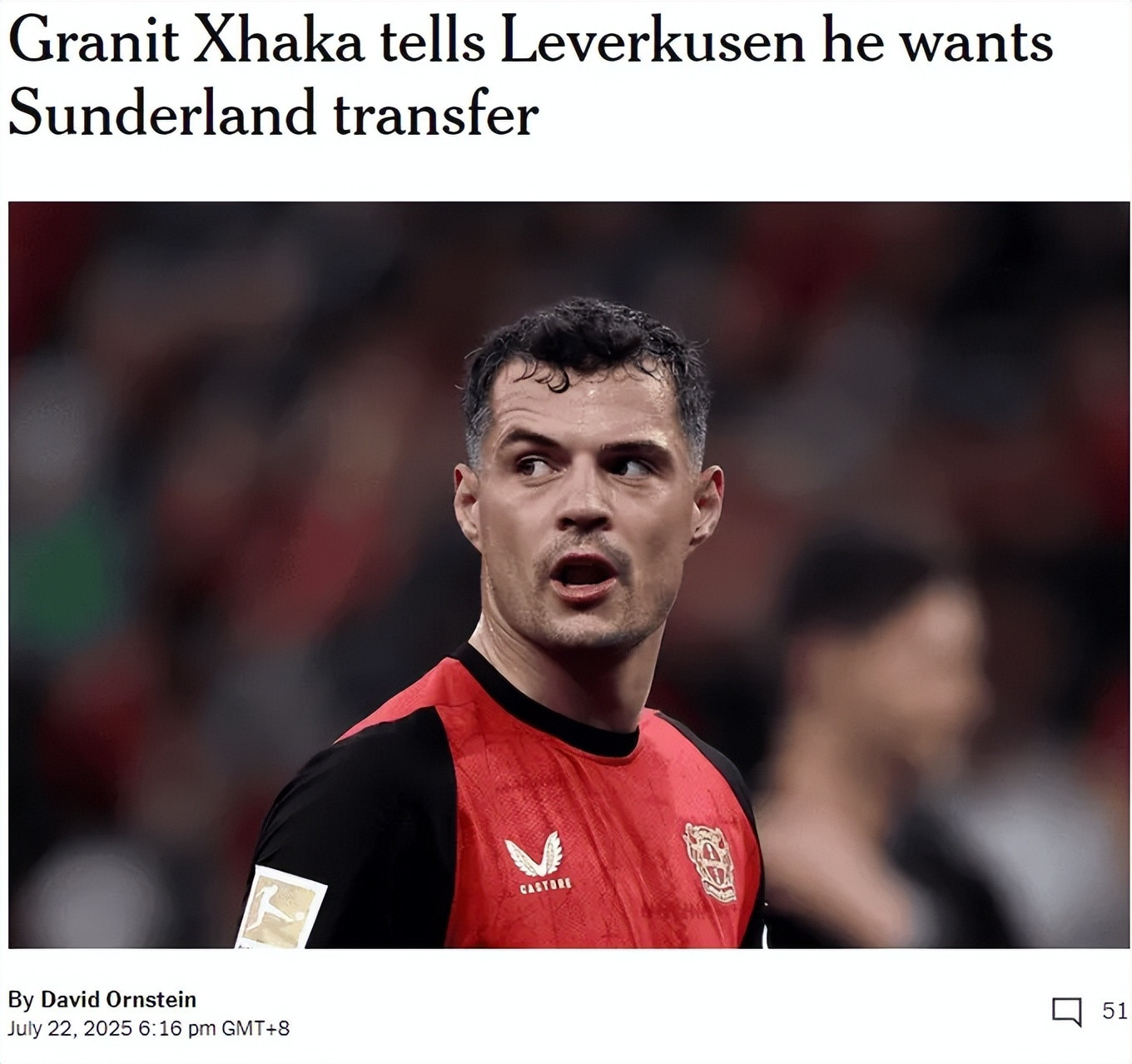 目前32岁的扎卡已经和桑德兰达成协议,瑞士人要求勒沃库森尽快完成交易,目前谈判正在进行中。