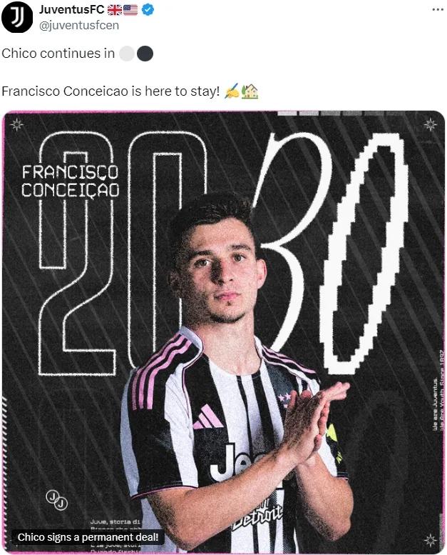 官方:尤文宣布从波尔图签下了小孔塞桑,这名边锋签下了一份2030年到期的合同。